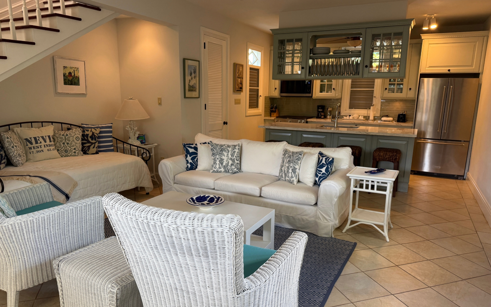 House is located in the popular Cliffdwellers area in walking distance to beaches at Cliffdwellers, Jones Bay, Tamarind Bay, Cades Bay, and Oualie Bay. Restaurants include Luna at SEASIDE, L’Escale, Yachtsman’s Grill, Oualie Beach Hotel, Chrishi Beach, Indian Summer and Dew Drop Inn. 5-minute drive to airport or Four Seasons with its golf and tennis; 3 minutes to water taxi pier, 10 minutes to Charlestown.