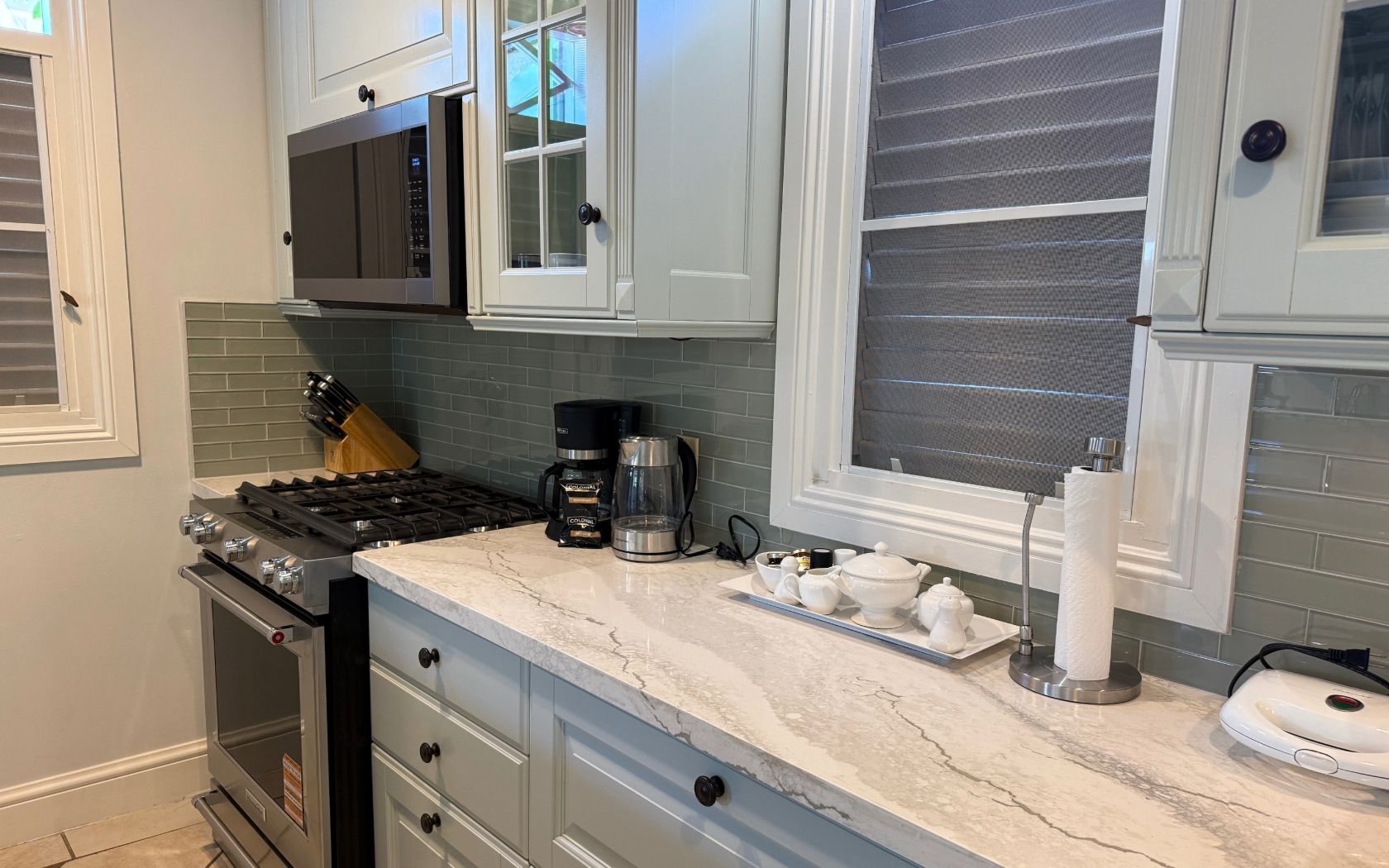 Gourmet kitchen with stainless appliances; granite counters; large pantry. Well-equipped with microwave and dishwasher. Open to living area and courtyard.
