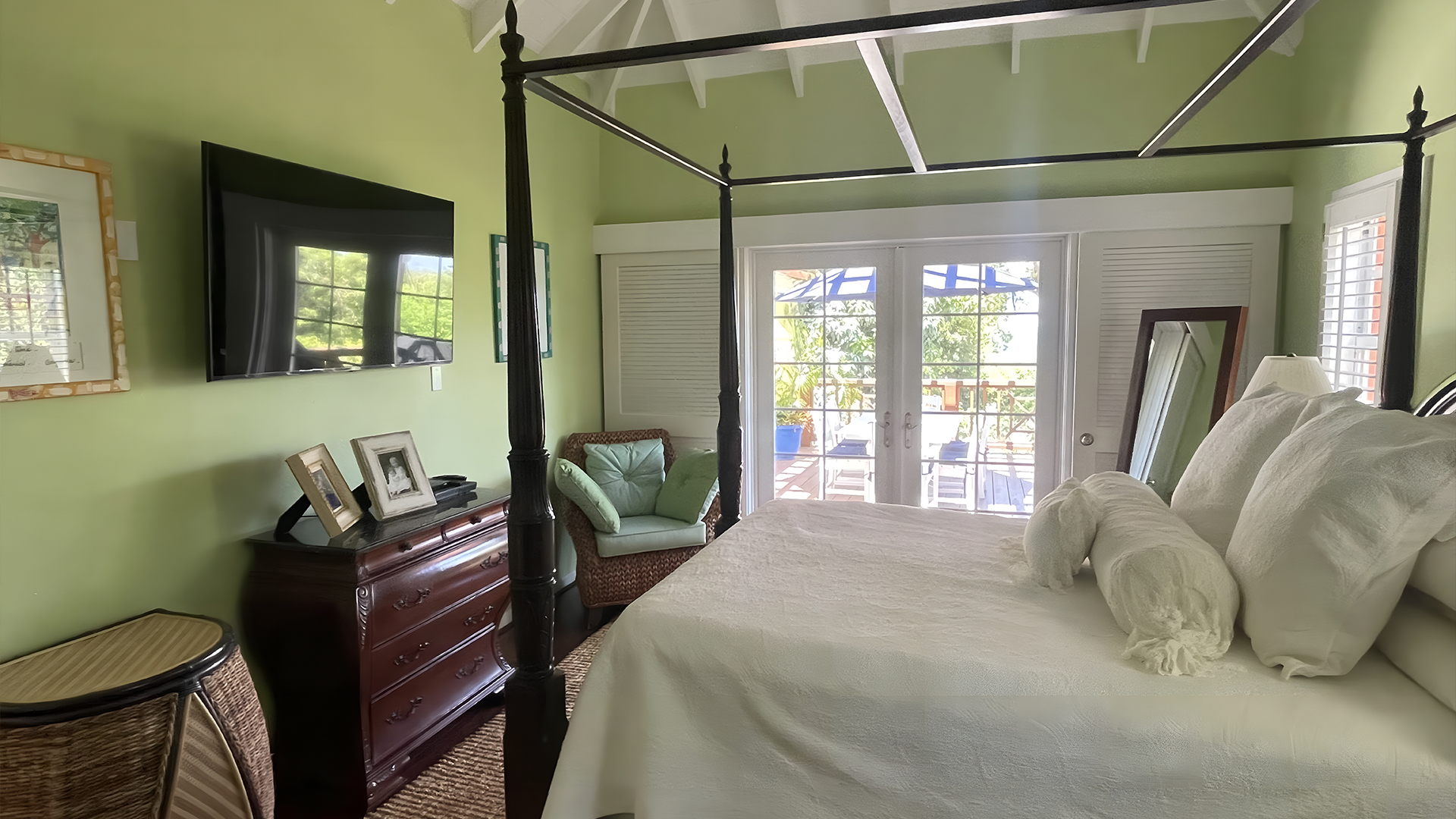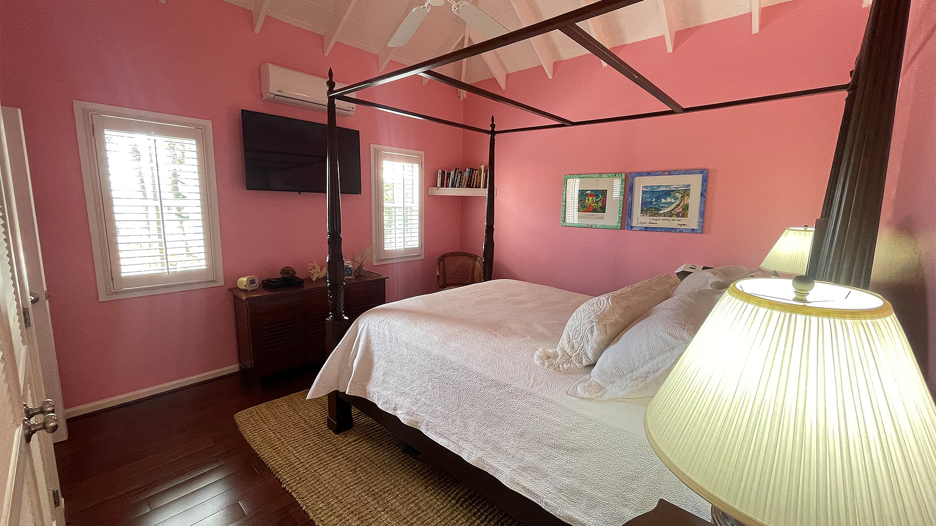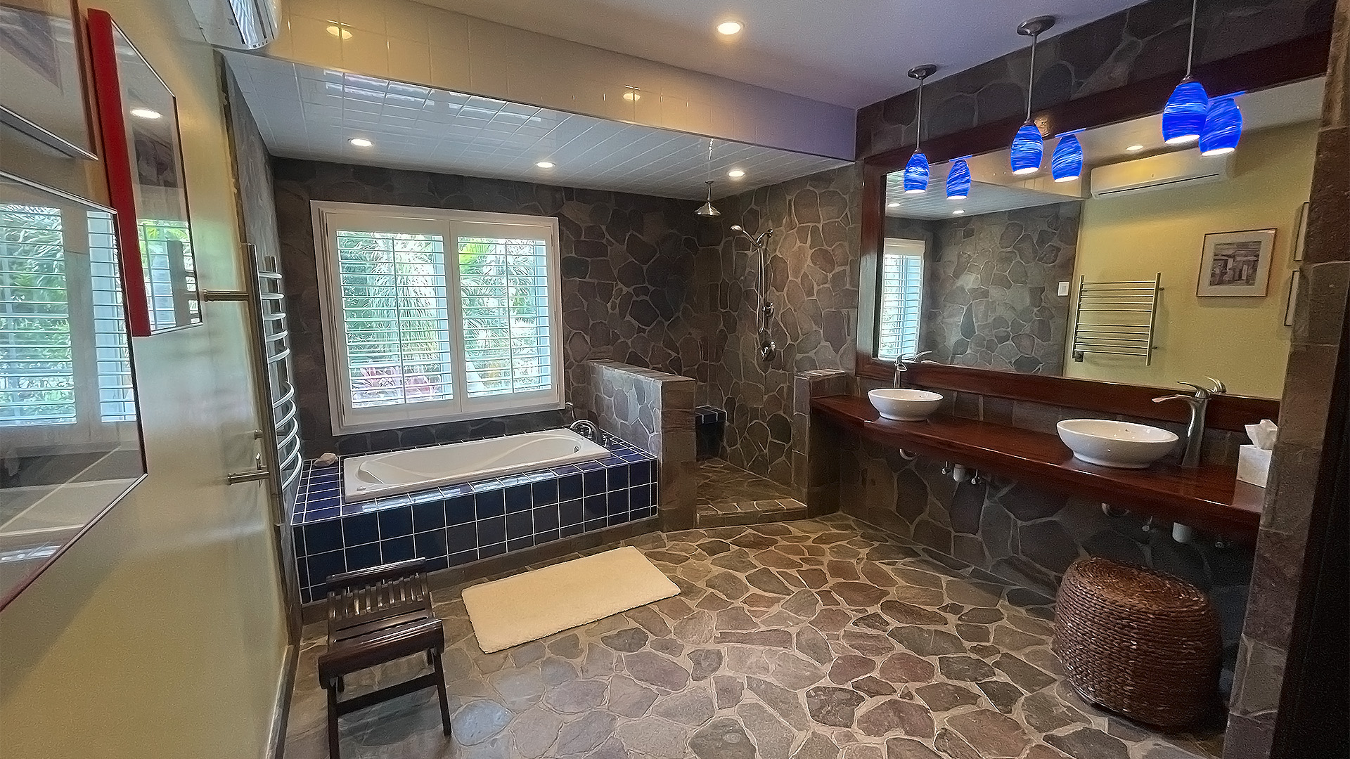 Four large double bedrooms with A/C and ceiling fans. Adjacent to main bedroom is a small single bedroom, perfect for a child. Four bathrooms..